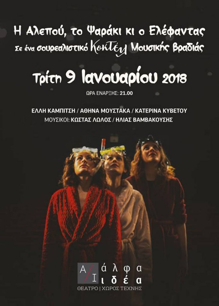 Το κροκοδειλένιο Άρλεκιν (Βασισμένο στο «Bed Time Stories» του Γιώργου Ηλιόπουλου) Σε σκηνοθεσία Παναγιώτη Κακατσίδη Πρεμιέρα στις 14 Ιανουαρίου 2018 Η θεατρική ομάδα «Η ΠΕΤΑΛΟΥΔΑ ΣΤΟ ΤΕΛΕΥΤΑΙΟ ΘΡΑΝΙΟ» παρουσιάζει «Το κροκοδειλένιο Άρλεκιν», μια πρόβα-παράσταση, μια σουρεαλιστική κωμωδία με στοιχεία αποδόμησης, που βασίζεται στο έργο «Bed Time Stories» του Γιώργου Ηλιόπουλου, στον «Τεχνοχώρο Φάμπρικα» από 14 […]