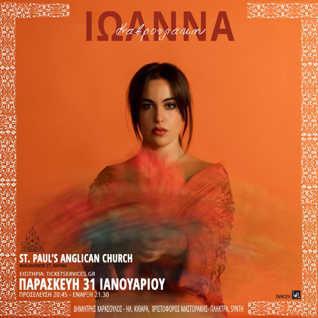 ΙΩΑΝΝΑ ΚΑΒΡΟΥΛΑΚΗ Αγγλικανική Εκκλησία Αγ. Παύλου Παρασκευή 31 Ιανουαρίου Η Ιωάννα Καβρουλάκη, έχοντας μπει σε τροχιά δημιουργίας του νέου της υλικού και με αφορμή την κυκλοφορία του νέου της τραγουδιού «Στο δρόμο», κάνει μια βόλτα σε μουσικές του κόσμου με αναφορές στο παρελθόν, την παράδοση και το παρόν και μας παρουσιάζει τα κεφάλαια από τα […]