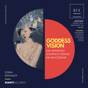 Η Sianti Gallery, ενώνει τις δυνάμεις της με το NYX Esperia Palace Hotel Athens και ενσωματώνει την τέχνη στον παλμό του ξενοδοχείου ξεκινώντας μία πρωτοποριακή καλλιτεχνική συνεργασία. Στο απόλυτο urban, μυστικιστικό και funky ξενοδοχείο της πόλης, την Παρασκευή 7 Μαρτίου στις 19:00 εγκαινιάζεται η ατομική έκθεση ζωγραφικής της διακεκριμένης εικαστικού Σοφίας Φωτιάδου με τίτλο “Goddess Vision” δημιουργώντας μια εκρηκτική σύμπραξη τέχνης και φιλοξενίας.