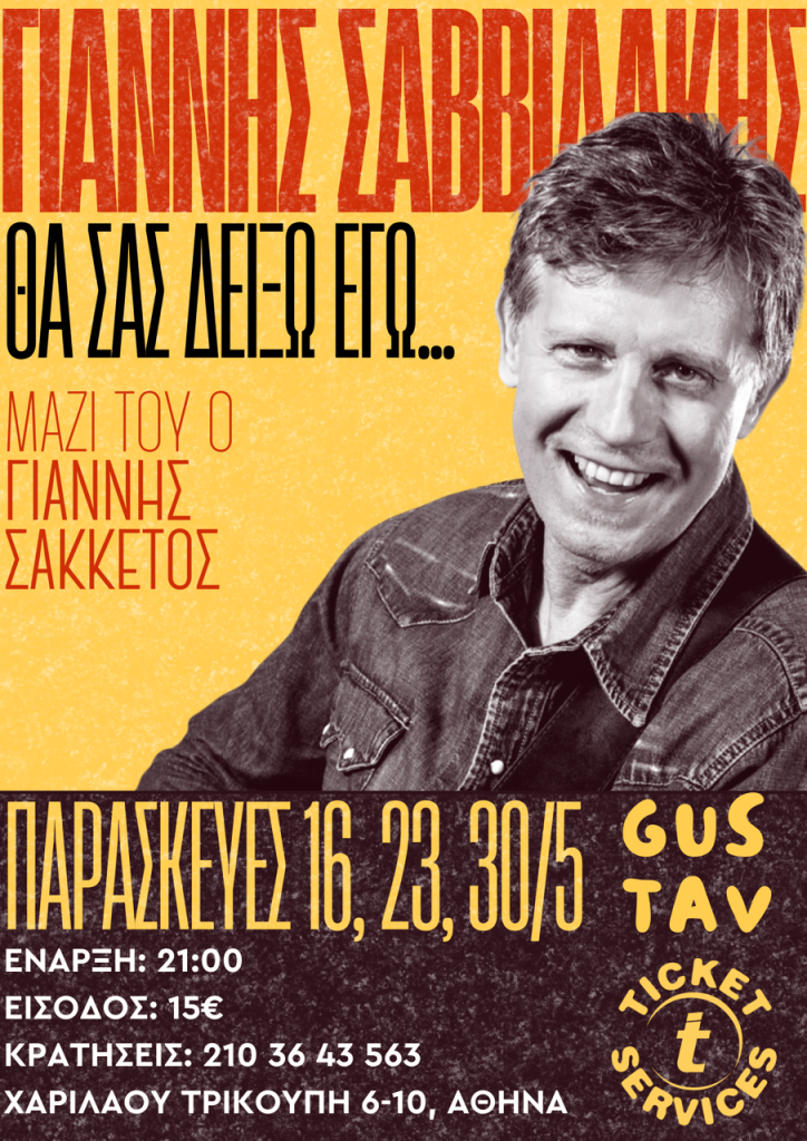 Ο πολυχώρος πολιτισμού GUSTAV παρουσιάζει: Γιάννης Σαββιδάκης «Θα σας δείξω εγώ…» Παρασκευή 16,23,30 Μαϊου, ώρα 9:00 μ.μ. Ο ΓΙΑΝΝΗΣ ΣΑΒΒΙΔΑΚΗΣ είναι πλέον γνωστό πως δεν εντάσσεται σε στερεότυπες καταστάσεις, δεν αναζητά λύσεις ασφαλείας και γι’ αυτό συνεχώς ψάχνει νέους τρόπους καλλιτεχνικής έκφρασης και όχι μόνο. Είναι γνωστός για δύο πράγματα. Για τα αυθεντικά, μελωδικά και δυναμικά του τραγούδια […]