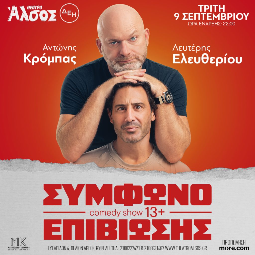 ΣΥΜΦΩΝΟ ΕΠΙΒΙΩΣΗΣ ΑΝΤΩΝΗΣ ΚΡΟΜΠΑΣ – ΛΕΥΤΕΡΗΣ ΕΛΕΥΘΕΡΙΟΥ ΤΡΙΤΗ 6 ΣΕΠΤΕΜΒΡΙΟΥ ΣΤΙΣ 22:00 ΘΕΑΤΡΟ ΑΛΣΟΣ ΔΕΗ Το «Σύμφωνο επιβίωσης» έρχεται στο Θέατρο Άλσος ΔΕΗ την Τρίτη 9 Σεπτεμβρίου για να μας χαρίσει μια ξεχωριστή βραδιά γέλιου γεμάτη εναλλαγές και ανατροπές! Ο Αντώνης Κρόμπας και ο Λευτέρης Ελευθερίου, το γνωστό κωμικό δίδυμο, ενώνουν τις δυνάμεις […]