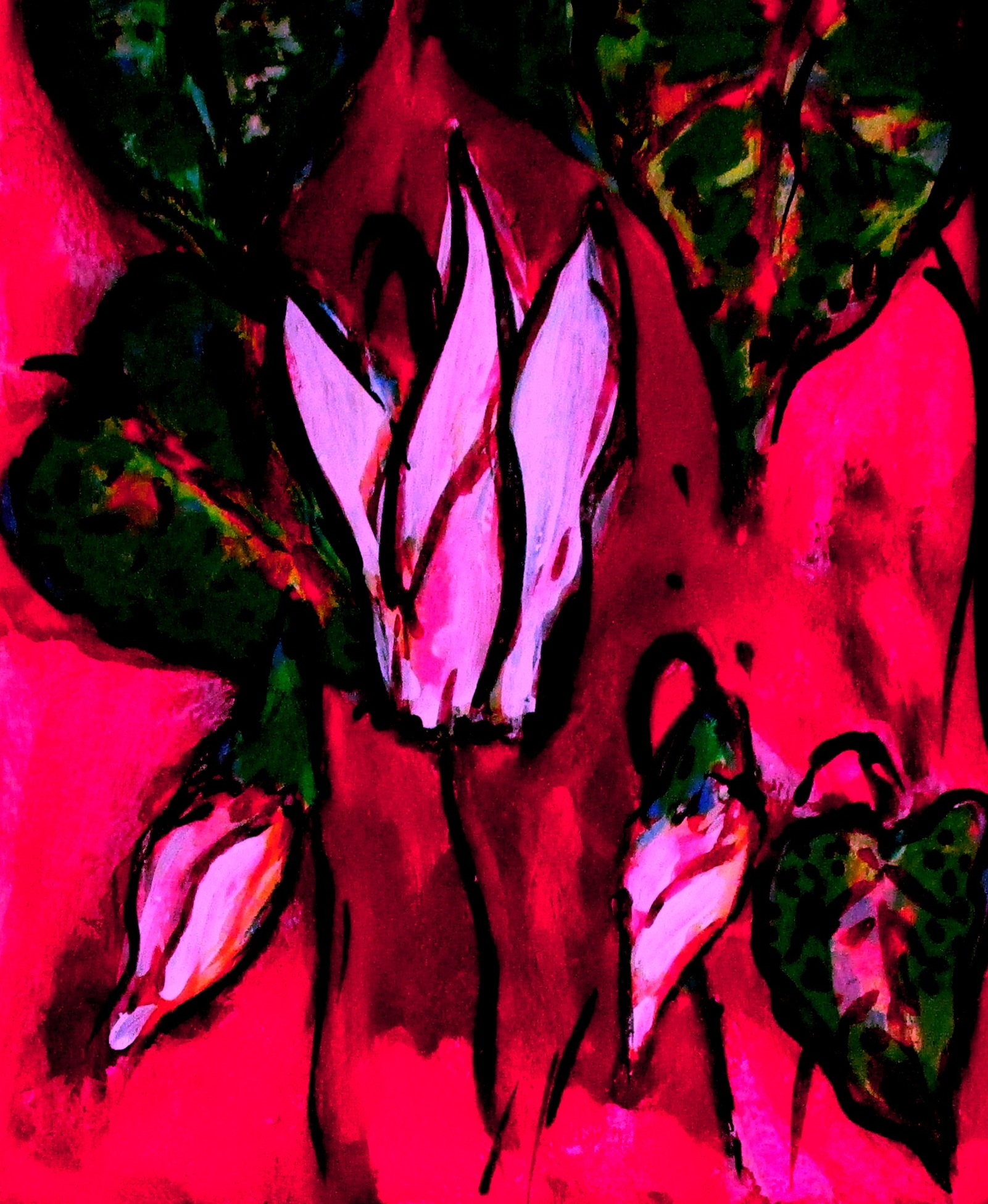 Στην αρχή πήρα μια σειρά φωτογραφίες που και αυτές αποτελούν κομμάτι της ευρύτερης ενότητας με θέμα «Τα αγριολούλουδα του Υμηττού» και μετά πειραματίστηκα σε έργα μικτής τεχνικής και το αποτέλεσμα είναι η δική μου θεώρηση και το ψάξιμο πάνω στην ομορφιά και τη δύναμη. Με τα χρώματα το ζητούμενο γίνεται ένα παιγνίδισμα, ένα διαρκές πέταγμα σε συναισθήματα και ελπίδες για μια συνέχεια, για το γέννημα στο βράχο ξανά. Όπως το κυκλάμινο που κάθε χρόνο μας υπενθυμίζει με πείσμα και θέληση τις εποχές που αλλάζουν, με το ίδιο πείσμα και στην τέχνη ορισμένα θέματα παραμένουν για πάντα στην πρώτη θέση. Το κυκλάμινο αντιστέκεται στη φύση και υπάρχει είτε στην ποίηση είτε σε οποιαδήποτε μορφή τέχνης ένα αξεπέραστο σύμβολο».