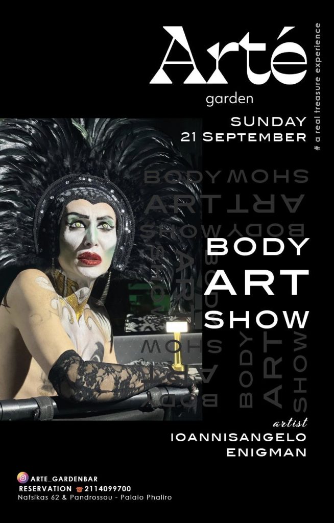 Κυριακή 21 Σεπτεμβρίου 9:30 το βράδυ ο Άντζελο θα κάνει ένα από τα φαντασμαγορικά body art show στο ARTE GARDEN στο Φάληρο σε έναν ιδιαίτερα προσεγμένο χώρο με μοναδικές καλλιτεχνικές πινελιές.   Την ενδυματολογική επιμέλεια έχει αναλάβει η Ευδοκία Βεροπούλου.