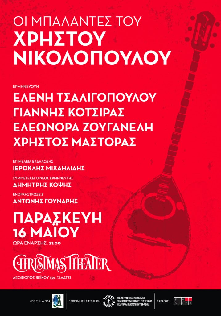 ΟI ΜΠΑΛΑΝΤΕΣ του ΧΡΗΣΤΟΥ ΝΙΚΟΛΟΠΟΥΛΟΥ Παρασκευή 16 Μαΐου Christmas Theater ΕΛΕΝΗ ΤΣΑΛΙΓΟΠΟΥΛΟΥ ΓΙΑΝΝΗΣ ΚΟΤΣΙΡΑΣ ΕΛΕΩΝΟΡΑ ΖΟΥΓΑΝΕΛΗ ΧΡΗΣΤΟΣ ΜΑΣΤΟΡΑΣ και ο νέος ερμηνευτής  Δημήτρης Κόψης Η προπώληση ξεκίνησε!  Ο Χρήστος Νικολόπουλος, ένας από τους μεγαλύτερους συνθέτες μας και από τα σημαντικότερα πρόσωπα της σύγχρονης μουσικής μας ιστορίας παρουσιάζει μια συναυλία – γιορτή την Παρασκευή 16 Μαΐου, στο Christmas Theater. […]