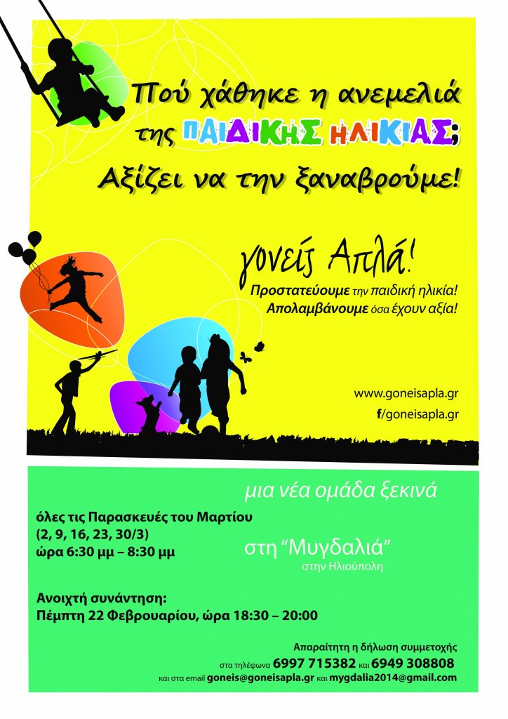 Πού χάθηκε η ανεμελιά της παιδικής ηλικίας; Αξίζει να την ξαναβρούμε! Αναζητάμε το «πώς» στην ομάδα «γονείς Απλά!» που ξεκινά στο ΣΩΜΑΤΕΙΟ ΓΙΑ ΜΙΑ ΕΛΕΥΘΕΡΗ ΠΑΙΔΑΓΩΓΙΚΗ «Η Μυγδαλιά», στην Ηλιούπολη για 5 συναντήσεις, όλες τις Παρασκευές του Μαρτίου (2, 9, 16, 23, 30/3) ώρα 6:30 μμ – 8:30 μμ ΑΝΟΙΧΤΗ ΕΝΗΜΕΡΩΤΙΚΗ ΣΥΝΑΝΤΗΣΗ (με ελεύθερη είσοδο): […]