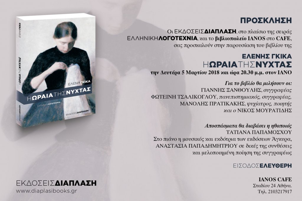 Η ΝΕΑ ΕΛΛΗΝΙΚΗ ΛΟΓΟΤΕΧΝΙΑ ΣΤΙΣ ΕΚΔΟΣΕΙΣ ΔΙΑΠΛΑΣΗ Γιατί υπάρχει και… καλή λογοτεχνία! Στο πλαίσιο της νέας σειράς των Εκδόσεων Διάπλαση «Ελληνική Λογοτεχνία» κυκλοφορεί το νέο μυθιστόρημα της Ελένης Γκίκα, «Η ωραία της νύχτας». Η Ελένη Γκίκα με την δημοσιογραφική της ιδιότητα καταπιάνεται με ένα αληθινό περιστατικό, που συγκλόνισε την ελληνική κοινωνία τον Αύγουστο του 2016 […]