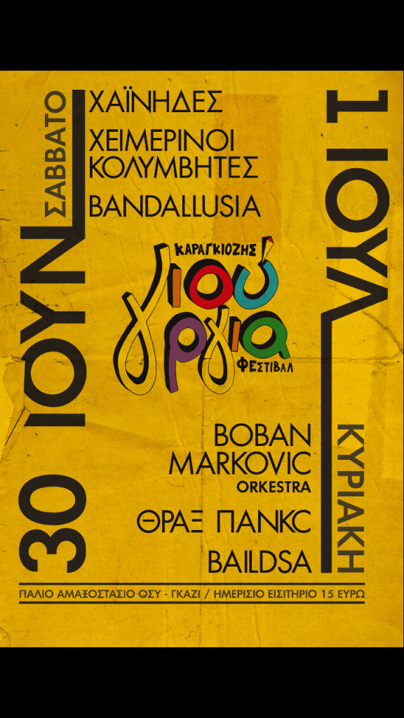 ΣΑΒΒΑΤΟ 30/6 & ΚΥΡΙΑΚΗ 1/7 ΚΑΡΑΓΚΙΟΖΗΣ ΓΙΟΥΡΓΙΑ ΦΕΣΤΙΒΑΛ “Τώρα την καλοκαιριά, μικρό μου” Καραγκιόζης Γιούργια Φέστιβαλ 30/6 & 1/7 Στο παλιό Αμαξοστάσιο στο Γκάζι Καραγκιόζης Γιούργια Φέστιβαλ από τα Εξάρχεια στο Γκάζι Αυτό το φεστιβάλ θα συμβαίνει απλώς καλοκαίρι Το ΚΑΡΑΓΚΙΟΖΗΣ ΓΙΟΥΡΓΙΑ είναι το καλοκαίρι στην Αθήνα Στο Παλιό Αμαξοστάσιο στο Γκάζι θα στηθεί […]