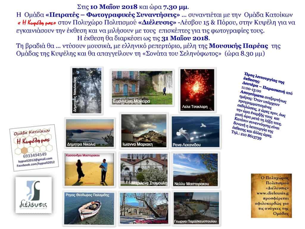 Την Πέμπτη 10 Μαΐου 2018 ετοιμάσαμε για τους Κυψελιώτες γείτονες μας άλλη μια ιδιαίτερη εκδήλωση. Συγκεκριμένα στις 7.30 μμ. στον Πολυχώρο Πολιτισμού «Διέλευσις» (Λέσβου 15 & Πόρου, Κυψέλη), γίνονται τα εγκαίνια έκθεσης φωτογραφίας από την Ομάδα «Πειρατές – Φωτογραφικές Συναντήσεις». Οι καλλιτέχνες θα μιλήσουν με το κοινό για τις φωτογραφίες τους. Η έκθεση […]