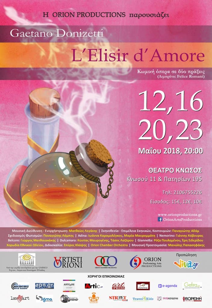 Όπερα “Το Ελιξίριο του Έρωτα” του Γκαετάνο Ντονιτσέττι Η Orion Productions, σε συνεργασία με το σολιστικό φωνητικό σύνολο Artisti Orioni, το σολιστικό ορχηστρικό σύνολο Orion Chamber Orchestra και τη Χορωδία Εθνικού Ωδείου, παρουσιάζει τη διάσημη κωμική όπερα «Το Ελιξίριο του Έρωτα» (L’Elisir d’Amore) του Γκαετάνο Ντονιτσέττι για 4 μόνο παραστάσεις, στο Θέατρο Κνωσός, στις 12, 16, 20, 23 Μαΐου 2018 και ώρα 20:00, υπό την αιγίδα του Ομίλου […]