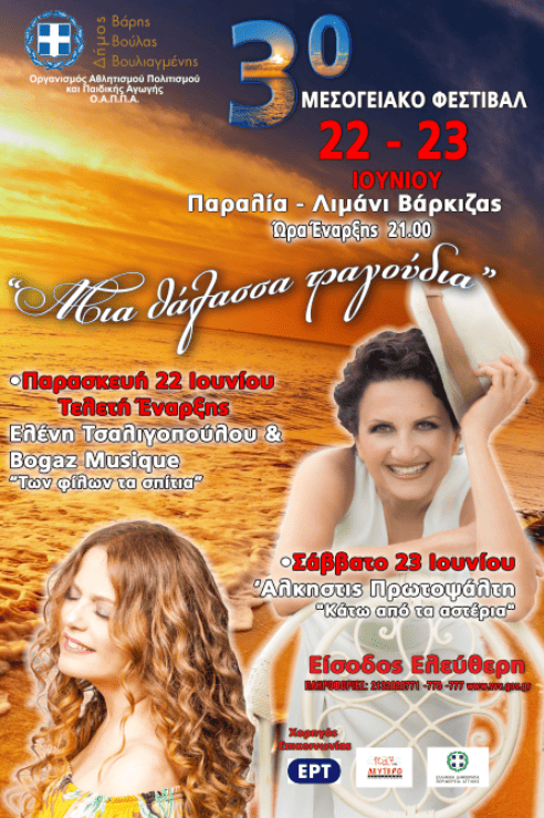 ΕΛΕΝΗ ΤΣΑΛΙΓΟΠΟΥΛΟΥ & Boğaz Musique “ Των φίλων τα σπίτια ” ΠΑΡΑΣΚΕΥΗ 22 ΙΟΥΝΙΟΥ: ΠΑΡΑΛΙΑ-ΛΙΜΑΝΙ ΒΑΡΚΙΖΑΣ 3Ο ΜΕΣΟΓΕΙΑΚΟ ΦΕΣΤΙΒΑΛ ΒΑΡΚΙΖΑΣ-ΒΟΥΛΑΣ-ΒΟΥΛΙΑΓΜΕΝΗΣ Την Παρασκευή 22 Ιουνίου, η Ελένη Τσαλιγοπούλου και οι Bogaz Musique εμφανίζονται στην Βάρκιζα, ανοίγοντας το 3ο Μεσογειακό Φεστιβάλ που διοργανώνει ο Δήμος Βάρκιζας-Βούλας-Βουλιαγμένης. Η συναυλία θα πραγματοποιηθεί στην παραλία (λιμάνι) Βάρκιζας στις 21:00 […]