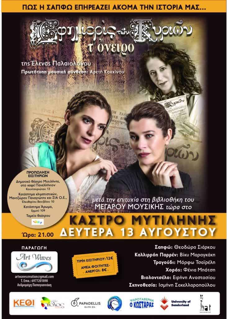 Εφημερίς των Κυριών, τ΄Ονειρο¨. – Δευτέρα 13 Αυγούστου – Κάστρο Μυτιλήνης ¨Εφημερίς των Κυριών, τ΄Ονειρο¨. Η επιτυχημένη παράσταση στην Βιβλιοθήκη του Μεγάρου Μουσικής Αθηνών , έρχεται στο Κάστρο της Μυτιλήνης . Μέσα από ένα ταξίδι στο χρόνο η Σαπφώ συναντάει την Καλλιρρόη Παρρέν, την μεγάλη αγωνίστρια για την ισότητα των δύο φύλων. Η μεγάλη μας […]