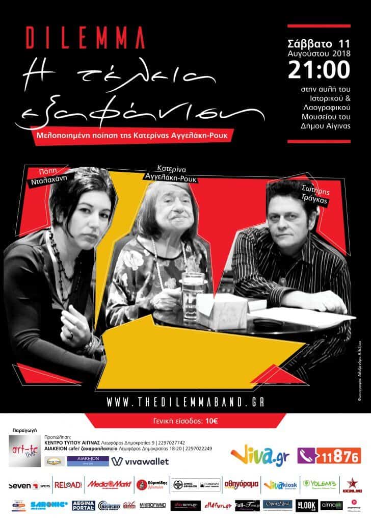 Σάββατο 11 Αυγούστου 2018 στις 21:00 στο Λαογραφικό Μουσείο της Αίγινας «H τέλεια εξαφάνιση» Dilemma live σε ποίηση Κατερίνας Αγγελάκη-Ρουκ Οι Dilemma, το Σάββατο 11 Αυγούστου 2018 στις 21:00 εμφανίζονται στο χώρο του Λαογραφικού Μουσείου της Αίγινας με αφορμή την κυκλοφορία του 6ου στούντιο άλμπουμ τους, που βασίζεται στη σύγχρονη μελοποίηση 12 επιλεγμένων ποιημάτων […]