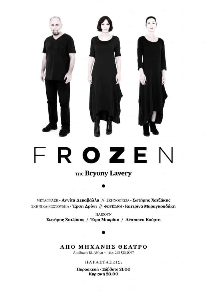 ΑΠΟ ΜΗΧΑΝΗΣ ΘΕΑΤΡΟ «FROZEN» της Bryony Lavery ΕΝΑΡΞΗ: ΠΑΡΑΣΚΕΥΗ 19 ΟΚΤΩΒΡΙΟΥ Στο Από Μηχανής Θέατρο θα παρουσιαστεί από την Παρασκευή 19 Οκτωβρίου το ψυχολογικό θρίλερ «FROZEN» της Bryony Lavery, σε σκηνοθεσία Σωτήρη Χατζάκη, με τον ίδιο, την Έφη Μουρίκη και τη Δέσποινα Κούρτη στους πρωταγωνιστικούς ρόλους. Το Frozen είναι ένα ψυχολογικό θρίλερ που αποτελείται από […]