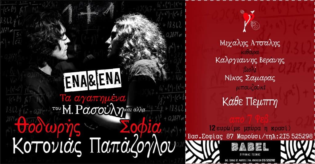 Θοδωρής Κοτονιάς – Σοφία Παπάζογλου Ένα & Ένα Τσικνοπέμπτη 28 Φεβρουαρίου με τα αγαπημένα τραγούδια του Μανώλη Ρασούλη στη BABEL! Δυο φίλοι καλλιτέχνες που έχουν συνεργαστεί αρκετές φορές στο παρελθόν, σμίγουν ακόμα μια φορά επί σκηνής της μουσικής σκηνής Babel, με ένα πρόγραμμα αφιέρωμα στα τραγούδια του Μανώλη Ρασούλη. Τις Πέμπτες στη Babel, o Θοδωρής Κοτονιάς και η Σοφία Παπάζογλου με τη ζεστή […]