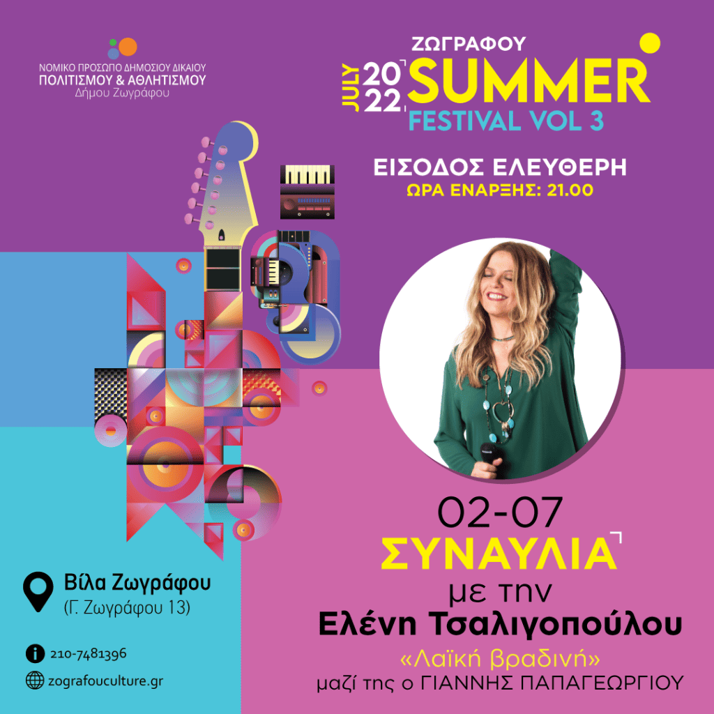ΕΛΕΝΗ ΤΣΑΛΙΓΟΠΟΥΛΟΥ “Λαϊκή βραδινή” μαζί της ο ΓΙΑΝΝΗΣ ΠΑΠΑΓΕΩΡΓΙΟΥ ΣΑΒΒΑΤΟ 2 ΙΟΥΛΙΟΥ 2022 ΒΙΛΑ ΖΩΓΡΑΦΟΥ Συμμετέχουν: ΜΑΝΩΛΗΣ ΠΑΠΠΟΣ ΣΑΚΗΣ ΚΑΡΑΚΩΣΤΑΣ ΒΑΓΓΕΛΗΣ ΚΑΡΙΠΗΣ ΣΠΥΡΟΣ ΧΑΤΖΗΚΩΝΣΤΑΝΤΙΝΟΥ ΑΓΗΣ ΠΑΠΑΠΑΝΑΓΙΩΤΟΥ ΕΙΣΟΔΟΣ ΕΛΕΥΘΕΡΗ H Ελένη Τσαλιγοπούλου μας προσκαλεί το Σάββατο 2 Ιουλίου στη Βίλα Ζωγράφου στην Αθήνα. Μία συναυλία γεμάτη σπουδαία τραγούδια που όλοι έχουμε αγαπήσει! Μαζί της έξι σημαντικοί δεξιοτέχνες μουσικοί και […]