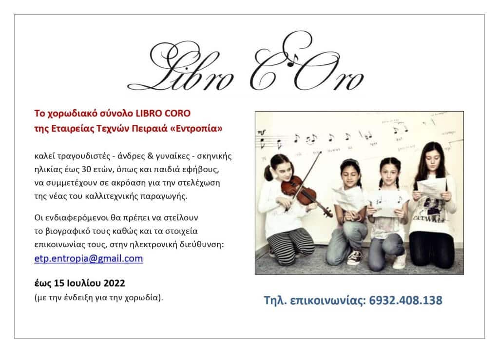 Libro Coro της Εταιρείας Τεχνών Πειραιά «ΕΝΤΡΟΠΙΑ» ΑΚΡΟΑΣΗ Το χορωδιακό σύνολο Libro Coro της Εταιρείας Τεχνών Πειραιά «ΕΝΤΡΟΠΙΑ» καλεί τραγουδιστές -άνδρες και γυναίκες-σκηνικής ηλικίας έως 30 ετών, να συμμετέχουν σε ακρόαση για την στελέχωση της νέας του καλλιτεχνικής παραγωγής (semi opera) που αφορά στην καλλιτεχνική περίοδο 2022-2023. Οι ενδιαφερόμενοι θα πρέπει να στείλουν το βιογραφικό τους καθώς και τα στοιχεία […]