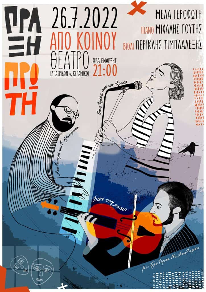 ΠΡΑΞΗ ΠΡΩΤΗ Τρίτη 26/7 στις 21:00 μια μοναδική μουσική παράσταση στην αυλή του θεάτρου Από Κοινού Κάθε τραγούδι μια ιστορία, κάθε ιστορία ένα μήνυμα. ΠΡΑΞΗ ΠΡΩΤΗ ένα μικρό αφήγημα με μελοποιημένη ποίηση. Μια μουσική περιπλάνηση ανάμεσα σε τραγούδια αγαπημένων Ελλήνων συνθετών και σε τραγούδια από τις δύο δισκογραφικές δουλειές του συνθέτη Μιχάλη Γούτη. ΠΡΑΞΗ ΠΡΩΤΗ η Μέλα Γεροφώτη, […]