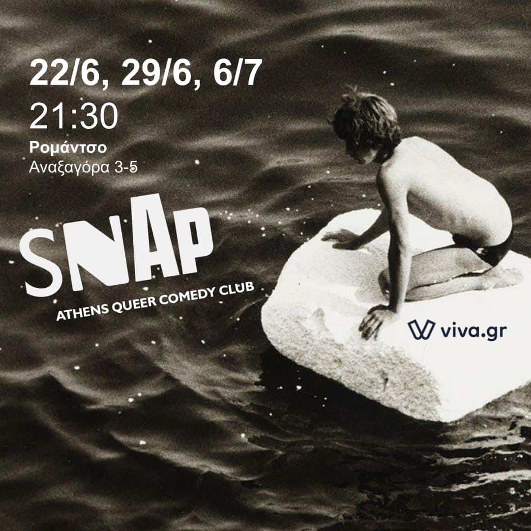 Το Snap – Athens Queer Comedy Club είναι το πρώτο και μοναδικό Queer Comedy Club της πόλης. Οι παραστάσεις που οργανώνει το Snap είναι ένα μείγμα Stand Up Comedy, Cabaret και LGBT+ Party. Περισσότεροι από 20 καλλιτέχνες αποτελούν τον πυρήνα του Snap, ενώ καλεσμένα του είναι μερικά από τα μεγαλύτερα ονόματα της ελληνικής κωμικής σκηνής.
