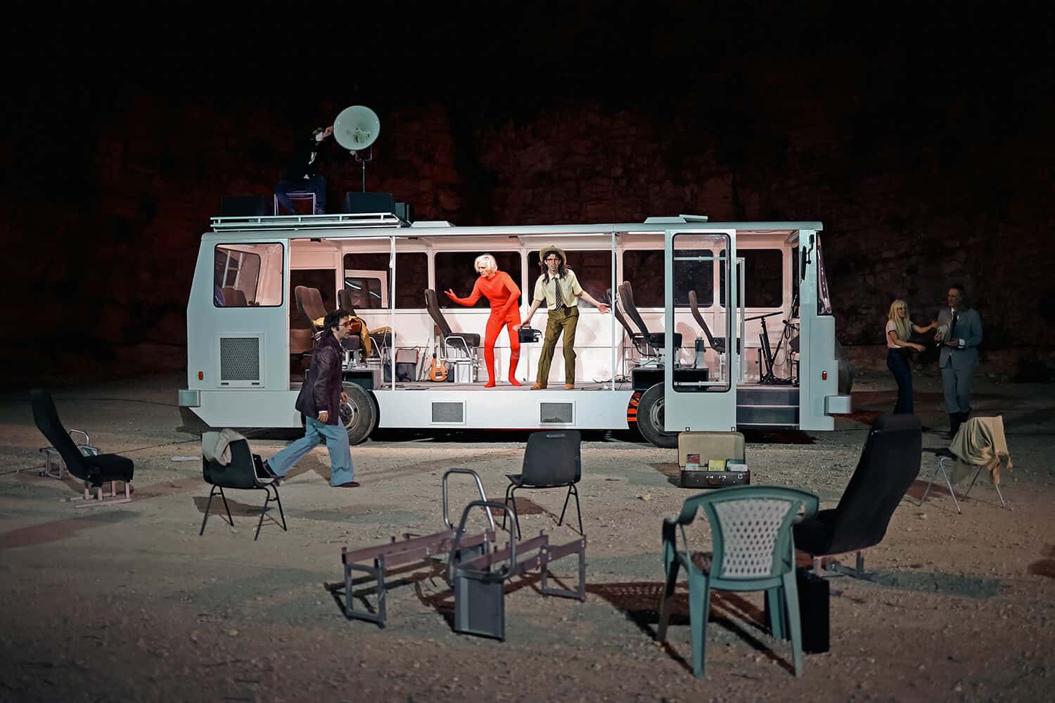 Η ιδέα της συνύπαρξης που κυριαρχεί στο έργο του Φιλίπ Κεν, εκφράζεται μέσα και από τον σκηνικό διάκοσμο της παράστασης: ένας αυτοσχέδιος καταυλισμός, μια ομάδα ηθοποιών σαν παιδιά των λουλουδιών της δεκαετίας του ’70, ένα λεωφορείο, άνθρωποι που βιώνουν μια κοινοβιακή κατάσταση.